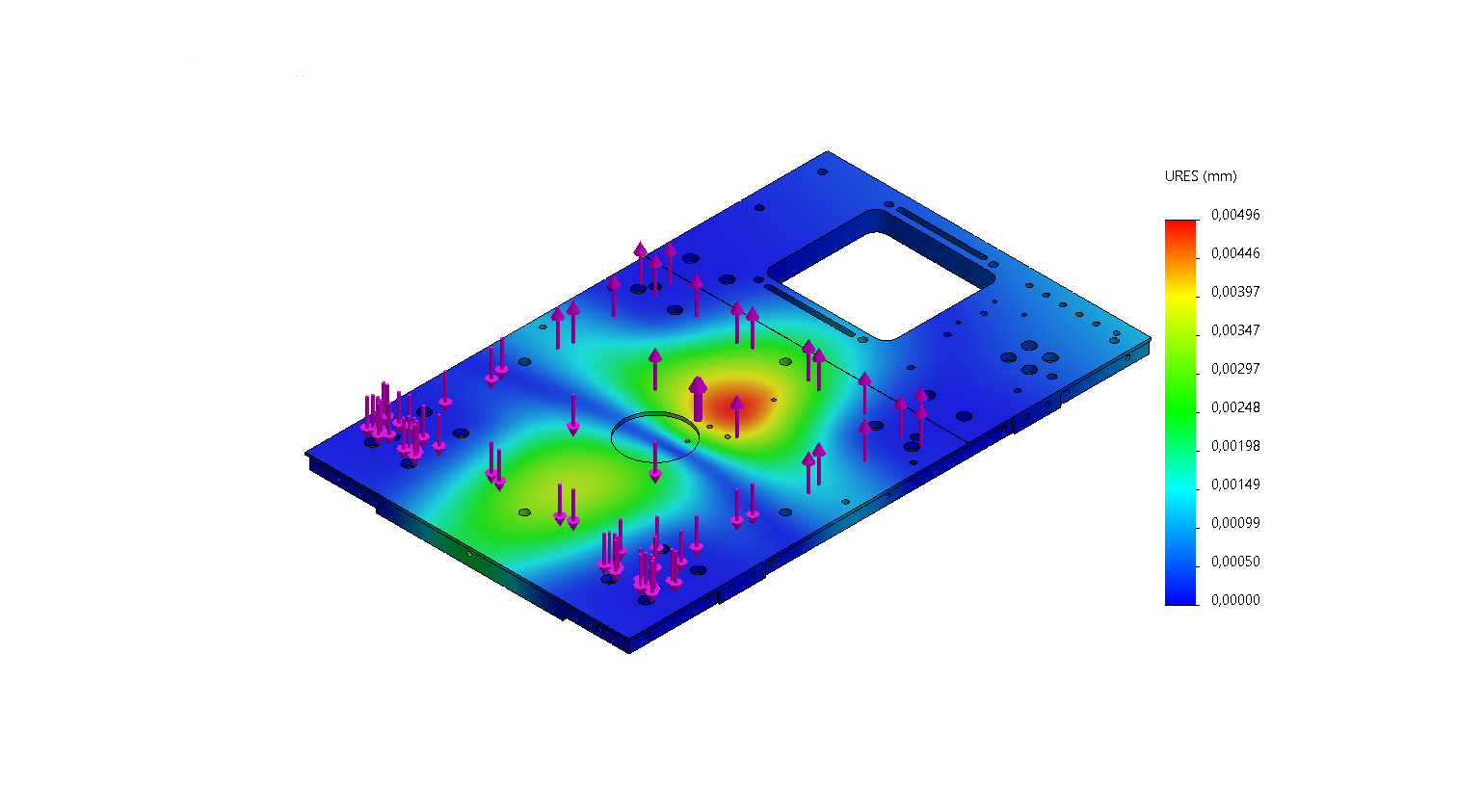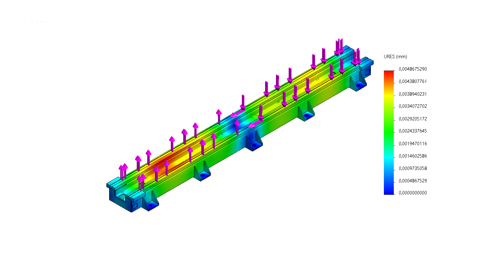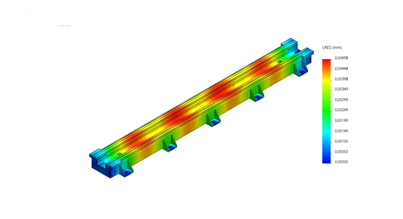 Při návrhu jednotlivých velikostí pojezdů byla provedena simulace deformace klíčových částí v kombinaci s daným zatížením. Dle výsledků statické a dynamické analýzy byla celá konstrukce optimalizována tak, aby každá velikost pojezdu vyhovovala dané řadě zatížení s vysokým koeficientem bezpečnosti. Hlavní pohybové komponenty byly propočítány na celkovou životnost minimálně 25tis provozních hodin nepřetržitého provozu při maximálním zatížení a dynamice.